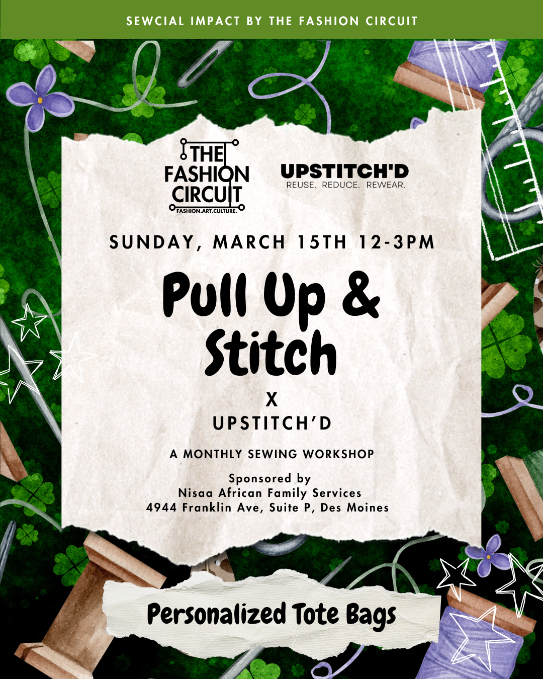 Join us Sunday, March 15th from 12–3 PM at Nisaa African Family Services (@nisaa.afs)for a hands-on workshop where we’ll be creating personalized tote bags.
