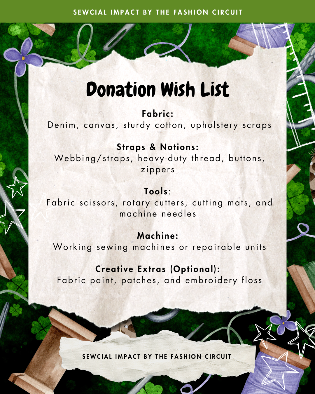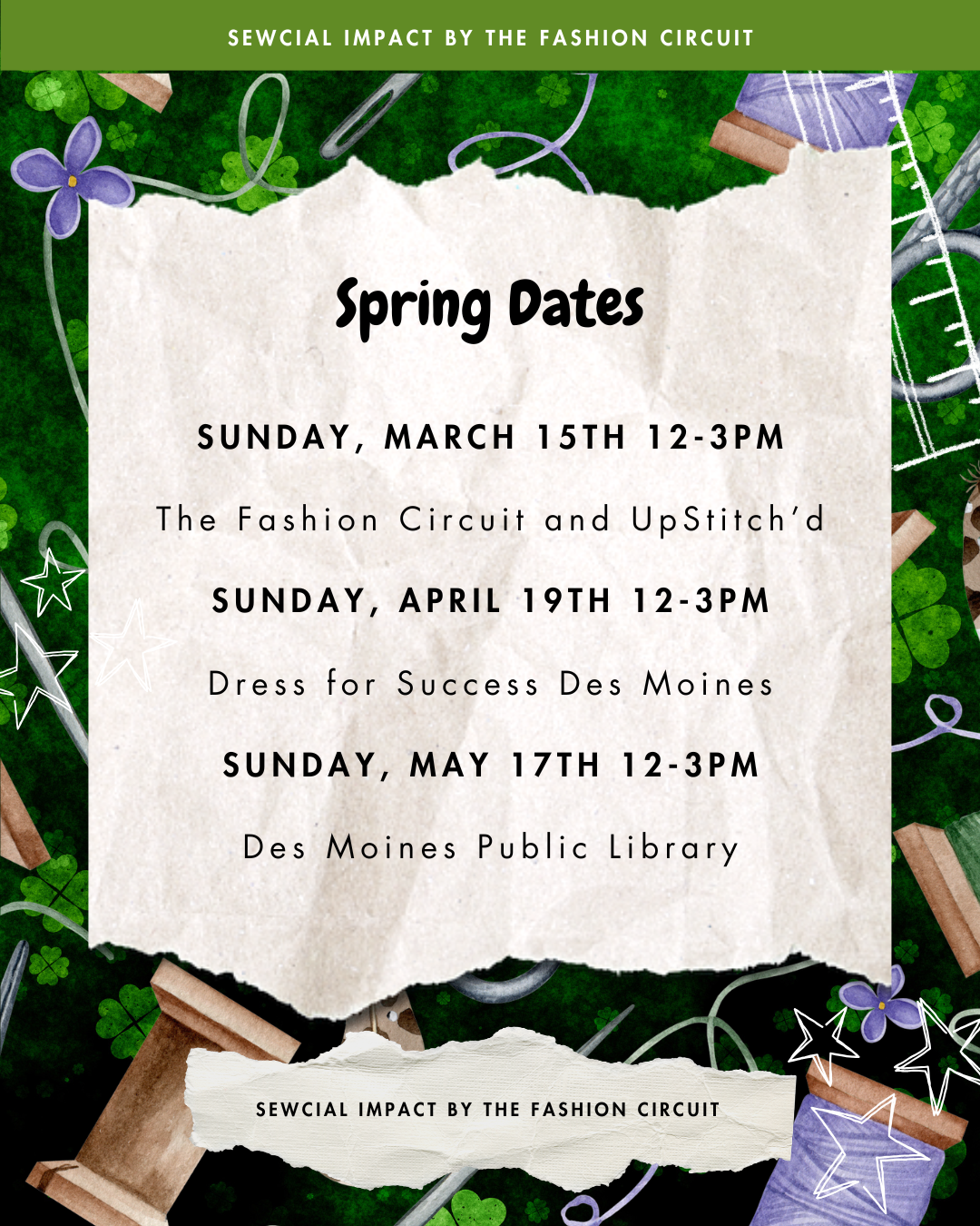 Pull Up & Stitch is our monthly sewing series designed to build skills and community. Each month, we partner with a different organization and host a donation drive in support of their work. This month, we’re collecting donations for Sewcial Impact by The Fashion Circuit and Upstitch’d Studios (@upstitchddsm) to help sustain our free community programming.